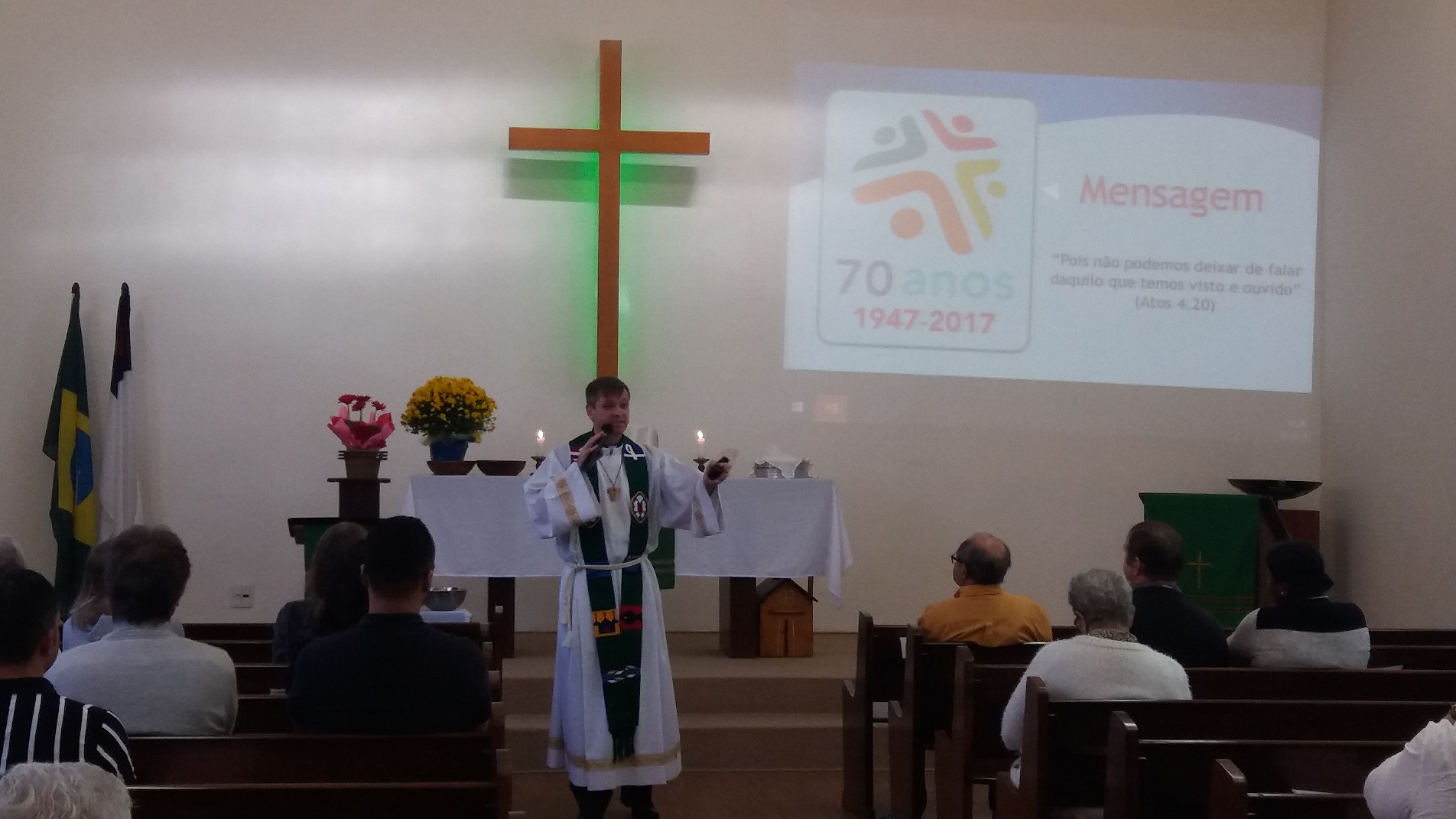 Na Congregação “ Da Paz” em São Paulo, a liturgia e o sermão foram ministrados pelo pastor Fernando Huf. A mensagem baseada em Atos 4.20 revela a importância de falar sobre o que vemos e ouvimos a respeito da boa-nova da salvação. A assistente de desenvolvimento de recursos da Hora Luterana, Izabel Loureiro, explicou sobre o programa “Grupos dos Evangelistas” e convidou todos os presentes para o jantar beneficente em comemoração aos 70 anos da Hora Luterana no Brasil, que acontecerá no dia 02 de setembro na Congregação “Redentor” em São Paulo. Estiveram presentes no culto 40 pessoas.