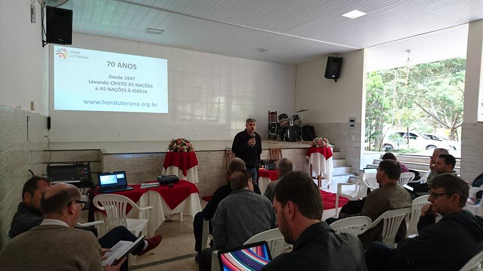 Entre os dias 18 a 21 de Setembro, na localidade de Parajú, município de Domingos Martins, região serrana do ES, o pastor Adelar Munieweg teve a oportunidade de conviver com cerca de 70 pastores dos estados do Espírito Santo, Bahia e Minas Gerais. O tema dos estudos foi “Reforma: passado ou presente”, responsabilidade do teólogo Dr. Frederico Pieper. Na quarta feira, o pastor Adelar foi o responsável pelo momento devocional e em seguida apresentou as principais atividades da Sociedade Missionária Hora Luterana. Os pastores presentes, juntamente com suas respectivas paróquias foram convidados e desafiados a um engajamento ainda maior nos desafios e oportunidades missionárias coordenadas pela Hora Luterana. Com alegria verificou-se a grande aceitação do devocionário Cinco Minutos com Jesus nesta região do Brasil.